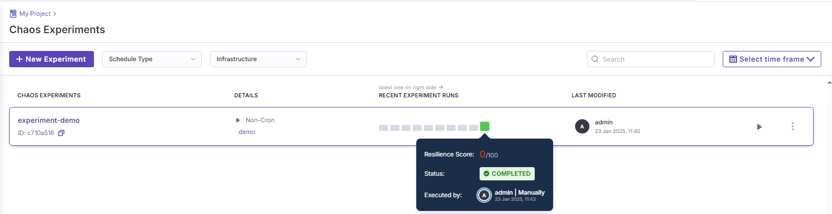 To observe a chaos experiment, user needs to select the highlighted experiment run box from the heatmap, it will redirect to experiment run execution page.